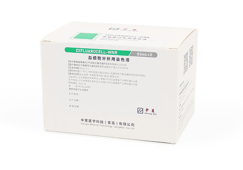 血细胞检测过程中,ZXFLUAROCELL-WNR染色液在WNR溶血剂协助下对WBC、嗜碱粒细胞、有核红细胞进行染色,并结合激光散射法及荧光染色的流式细胞技术进行WBC、嗜碱粒细胞、有核红细胞分类计数。